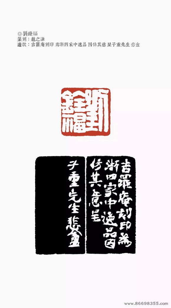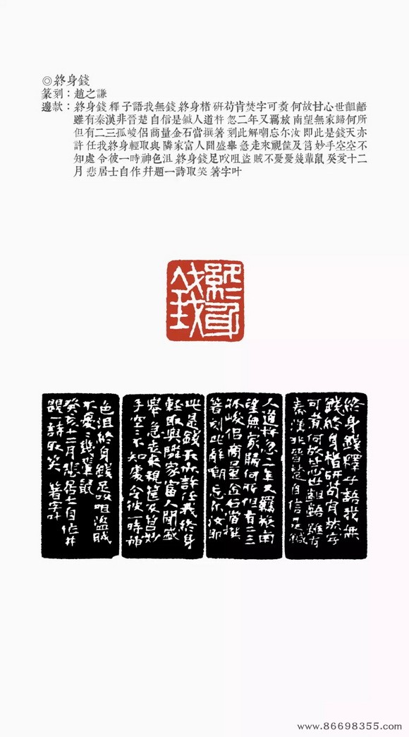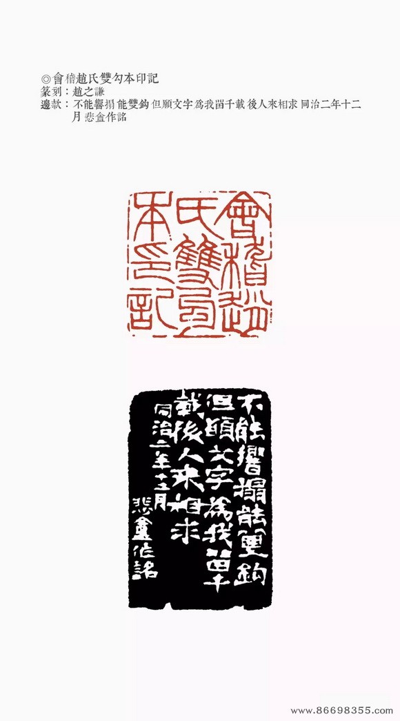 十二月,作“会稽赵氏双勾本印记”、“终身钱”。是年刻印亦有“树镛审定(朱白两方)”、“福德长寿”,当是年刻印有“刘铨福”、“二金蜨堂藏书”、“绩谿胡澍荄父/同孟子四月二日生”、“沉树镛”、“寿如金石佳且好兮”。