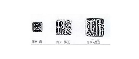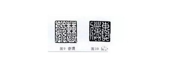 “程灶”(图8)中,“程”字“禾”部共有五处局部粗笔,都是在笔画间隙较大处,拉近了笔画间的距离。在“新成甲”(图3)、“李堪”(图2)、“曹”(图9)等印中都有这种用法。这是汉玉印最常用的手法之一,它的上源在春秋战国鸟虫篆金文中,例子很多,本文中举为例证者也有类似处理者,不另举例。