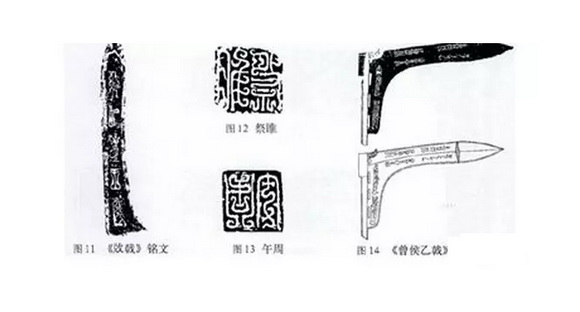 “贵仆”(图10)中,“贵”字腹内两横作一对称的花纹图案,绝无仅有。这一图案在春秋战国时的“戟”(图11)中有一个完全相同的造型,即第一字“”字的“口”部。这一特例从一个侧面证明了汉鸟虫篆玉印与春秋战国金文的浓厚渊源。“戟”的很多装饰习惯和汉鸟虫篆印何其相似!