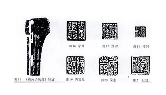 这种情况一般发生在类于“木”的中竖上。留空太多怎么办?这一中竖左右盘曲,或加以饰笔,原本对称的结构变得不再对称。这种处理也是春秋战国鸟虫篆金文的余绪。如“蔡公子果戈”(图15)的“果”字,就是以中竖的盘曲来打破整个字的对称。汉玉印“常”(图16)、“杨玉”(图7)的处理都与“蔡公子果戈”一脉相承,只是字形更规范些。“常”是一方具象化的作品,但这个局部是抽象的盘曲。这里的总结是对抽象化的,但也适用于具象化的一类,举例中更不可避免对后者的引用。