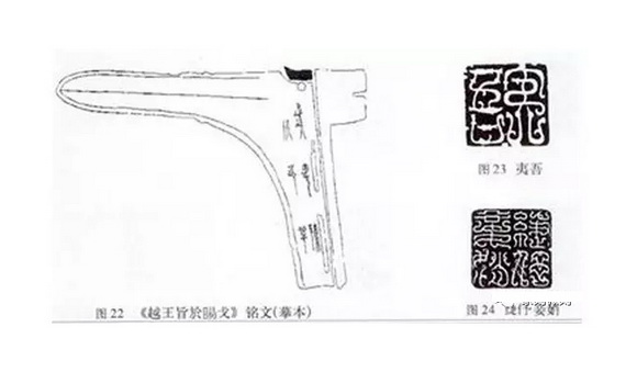 这类处理最突出的例子是类于“木”字下半段的结构。比如“新成甲”(图3)、“杜说”(图21)、“午周”(图13),都在主笔中竖上加了一笔与之交叉的短笔,这是汉鸟虫篆玉印中特有的现象。这种处理手法未见之于春秋战国鸟虫篆金文。虽然在《越王旨於戈》(图22,摹本)中,右下角“(徐)”字“余”部的类似结构中,在中竖上加了一短横,但只是点的扩大,与汉鸟虫篆玉印中的这类处理无甚关联。目前,我们尚未找到这类处理的上源。这种处理很完美地解决了这类结构留空多、只靠盘曲又单调的问题。但是,这种处理也易引起人们的误解,误以为这种花饰是一笔笔画。就拿“杜说”、“午周”这两方印来说,在《鸟虫篆大鉴》中,“杜说”的“杜”字未能释出(此书未收“午周”);在《古玉印集存》中,“午周”两字均未能释出(此书未收“杜说”)。我们虽不能责备古人,但这一现象也足以提醒我们,鸟虫篆印装饰中的旁加花饰应该慎重,不能因为创作时随意加花饰而导致作品文字古怪,让人无法释读。