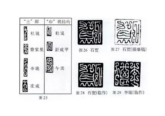 汉鸟虫篆玉印传世约40方,非常稀少。这些印除了成双成对出土的,基本上是每印各出一奇,类于汉碑隶书的多变特征。尽管如此,从这40方印中出现三次以上的文字偏旁结构来看,其处理是有法可循、有一定规律的。我们以“土”部和篆书“巾”状结构(即“木”部下半)为例,列表分析(图25)。