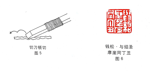 其一,横执法(图1)。以指、食指与中指撮紧刀身前段,拇指固刀身,食指力下压,中指力上托,使刀柄横卧于食指根部,无名指前伸顶住印石边侧,以稳定刀势。刻日时集拇、食、中三指之力,向左推移前行(图2),利用刀刃型开石面,形成力点连续、起伏较少的冲刀线条(图3);或者上下摇动刀杆(图4),使刀角入石,刀刃向前顿切起伏(图5),形成积点成线,波折涩进的切刀痕迹(图6),此法由于发挥了无名指的固定作用,使运刀的力点与方向易于调控,少有滑刀之虞,因此适用于刻治偏小或中等大小的印面。