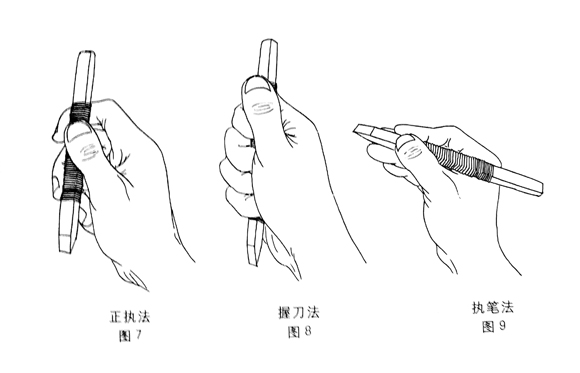 除上述三种执刀法之外,还有执笔法,即捉刀如握钢笔(图9),刀尖向前,与石面形成一约45”夹角,刻时刀从后面向前顶冲。这种执刀由于不易控制冲力的大小,往往容易滑刀,故非老手不宜为之。执刀只是刻用刀的第一步,不必过于拘泥,创作作时可根据个人习惯、喜好进行调节。比如以横执法刻治时,如如遇印石中有砂钉等情况,印面过于坚硬,使不上劲,也可换作握刀法,集腕、肘、肩、背之力攻坚破险,或可轻松过关,履险如夷用握刀法所刻线条过于粗糙,难以掌控时,也可换用用横执法,以取得精微细膩之效。