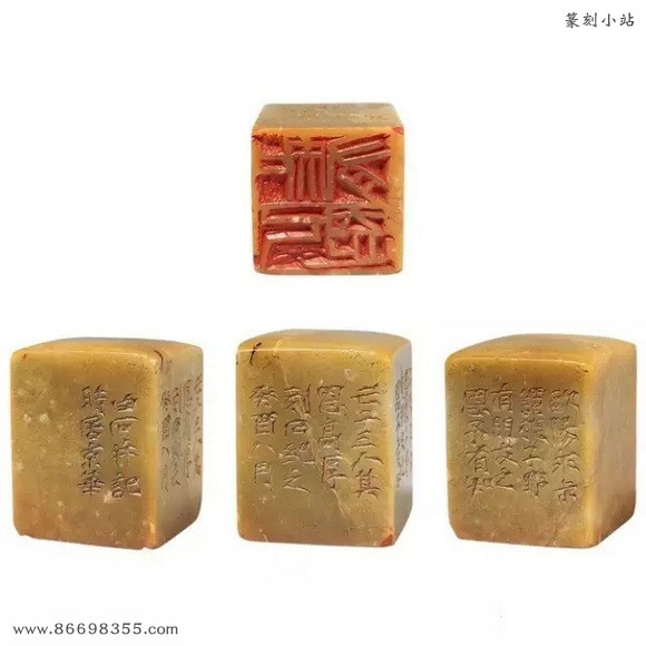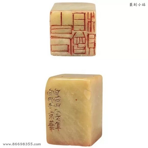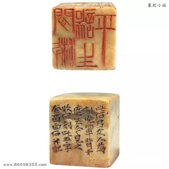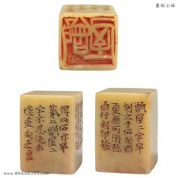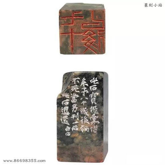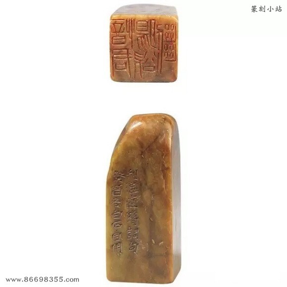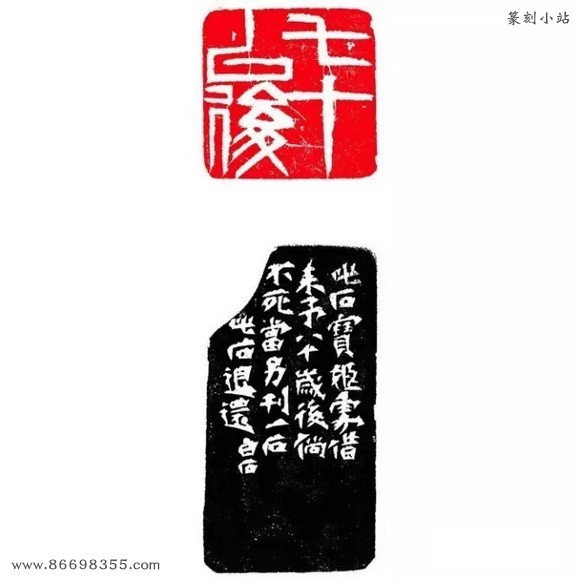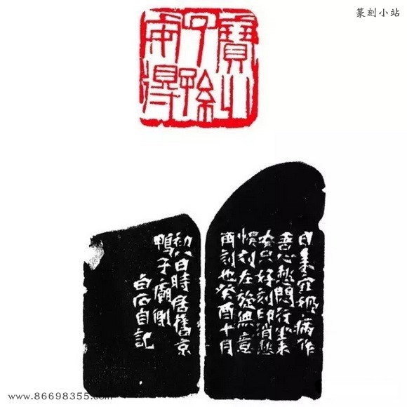 边款:此石宝姬处借来,予八十岁后倘不死,当另刊一石,此石退还。白石。