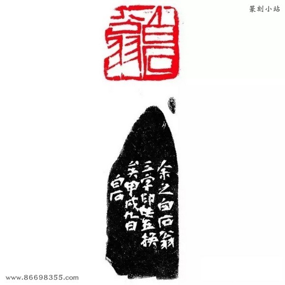 边款:余之“白石翁”三字印,此五换矣。甲戌九日。白石。