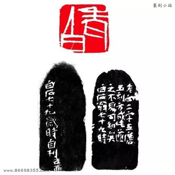 边款:“老白”二字五磨五刻方成,此道之不易可知矣。白石翁七十九时。白石七十九岁时自刊。己卯。