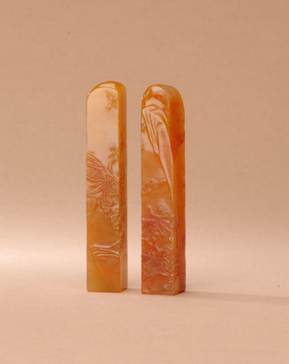 由于薄意浅刻如画,耗材甚微,所以特别适合于雕琢像田黄石、芙蓉石之类珍品原石。印章石材的表面有时难免会有一些裂痕、砂格或不纯的色块、斑纹,即便是田石、水坑冻之类名贵石品也难求纯洁无暇。倘若这些瑕疵出现在印体部位,无法通过钮雕加以利用遮掩。不施艺术处理,势必影响到石章的品级,过分雕琢又容易损坏宝石的天然文彩。在这种情况下,雕饰薄意于石面就成了最理想的装饰方法。
