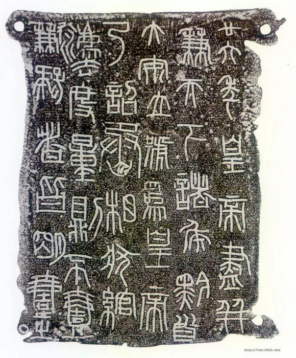 相传秦诏最初为李斯所书,不过设想一下全国那数不清的权量,上面的铭文当然不可能出于一人之手。加上官吏们对下级的意识决不如对天子那样恭敬,所以与《泰山石刻》相反,秦诏铭文中虽然也有严肃、工整的,但大多数纵有行,横无格,字体大小不一,错落有致,生动自然。更有率意者,出于民工手中,或缺笔少画,或任意简化,虽不合法度,却给人们以天真、稚拙的美感。