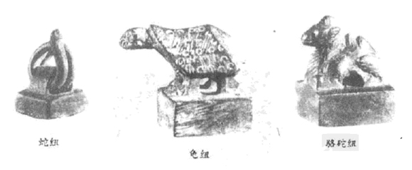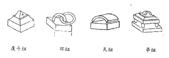 钮首造型主要有线条型和动物型。在秦以前大量的纽首是线条型,直线构成的有台组、覆斗组;曲线构成的有环纽、瓦纽、纽;曲直线构成的有亭组、提梁组、坛組。自秦代以来动物纽首一直相当流行,常见的动物纽有骆驼纽、蛇纽、虎纽、龟纽,动物纽形象鲜明生动,如蛇纽,盘曲的身子,左右随势弯曲,中间上下起伏,不仅显示了蛇的形象特征,而且也便于提取和系绳。明代以来由于石章普及使用,纽首的加工也较铜印方便得多,因此纽首的造型也更加丰富,形态各异的盘龙纽、狮纽等成为最常见的造型。
