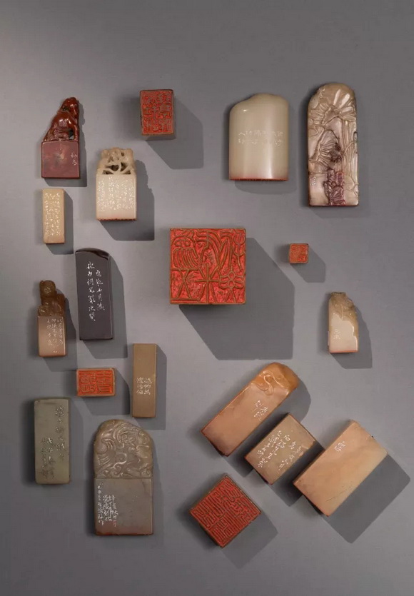 “拈笔古心生篆刻—清代以来名家闲章及自用章”专题便是三百年来文人篆刻的一扇小窗口。“拈笔古心生篆刻”七字采自宋人秦观的诗句,不知这是否“篆刻”最早入诗的证据,然以此七字来诠释篆刻艺术与文人趣味的相互结合,却出奇的妥帖。专题集中了清代以来众多文人篆刻家自用印,有艺术家为友人所刻者,有自用者,所涉名家如丁敬、赵之琛、钱松、赵之谦、胡菊邻、徐三庚、吴昌硕、齐白石、来楚生、陈巨来等,皆是文人篆刻艺术史上的重镇;他们的这些杰作,同样也在文人篆刻史上享有极大的盛名。