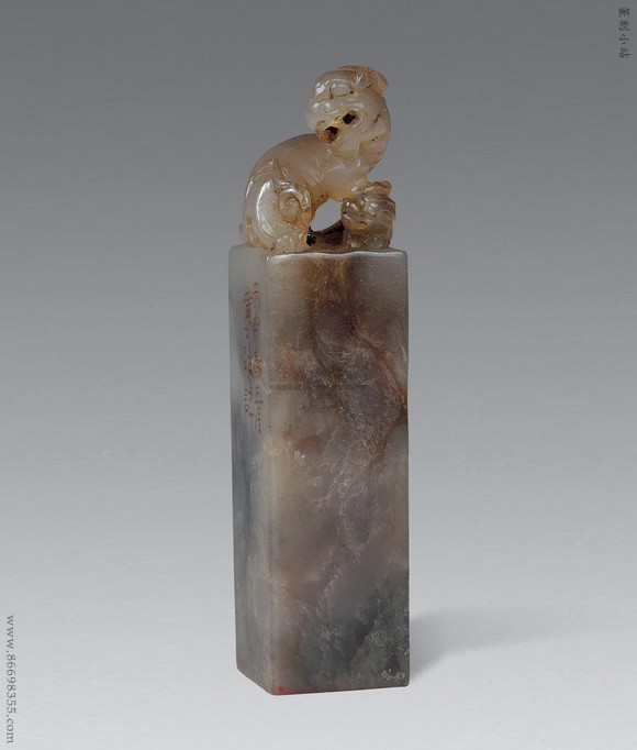 材属寿山牛角冻佳石,质地细腻通灵,明澈温雅,色如牛角,肌理隐有水流纹,浓淡交织,黑中带赭,得自然天成之妙趣。圆雕瑞兽钮,蹲立回首,体态舒展,神情威严,浑朴可爱,线条流畅,刀法娴熟。