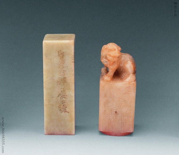 青田章料一雕狮钮,一为素方章,材质朴素,印文一为“何如”,边款为“略师峿亭铭篆法,丁酉二月牧甫为叔铭作”;一为“李连城”,边款为“鬘瓮邮属,士陵”。