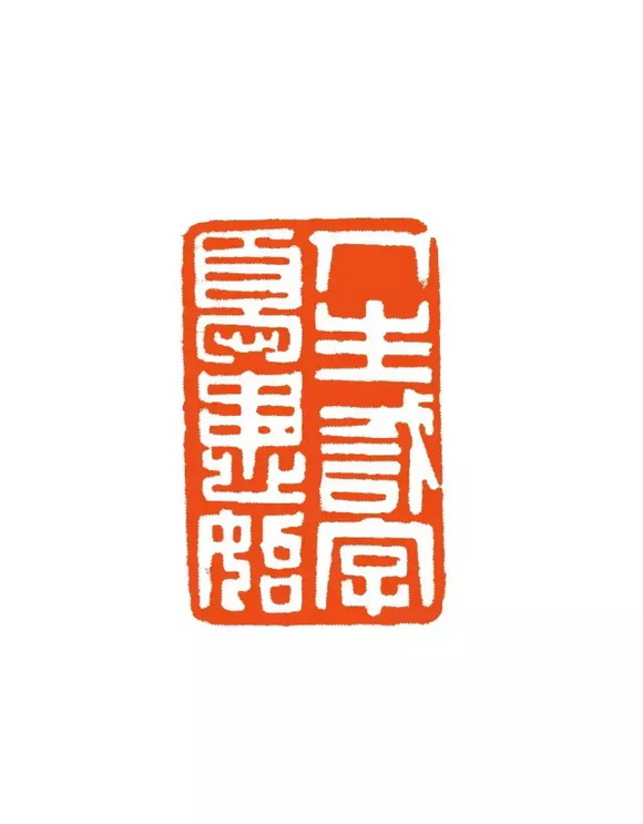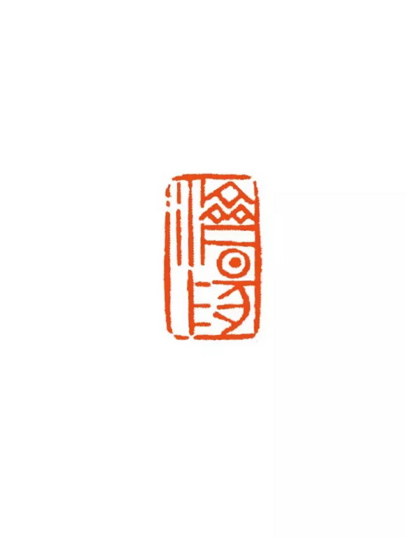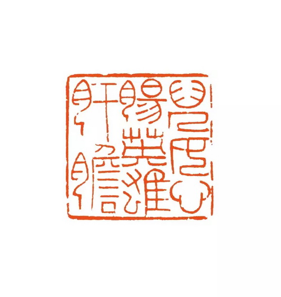 此印用线光洁饱满,厚重圆浑,把字型结构安排成长方、扁方、宽形、窄形的,以形造势,因势赋形,整个印面的横线水平微微向右倾一个角度,造成了此印的险,但是因为线条的厚重和字势的均衡而仍然显得很稳,泯除了显露的刀痕,此印透露出一种圆厚的淳拙味。