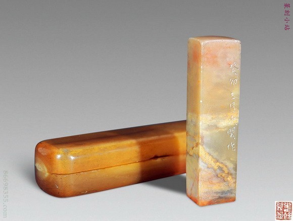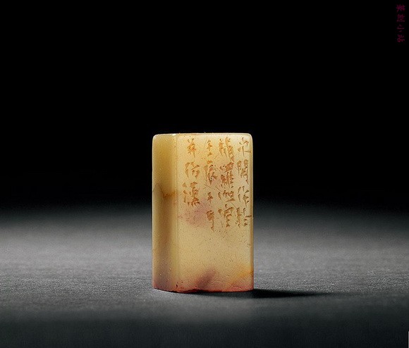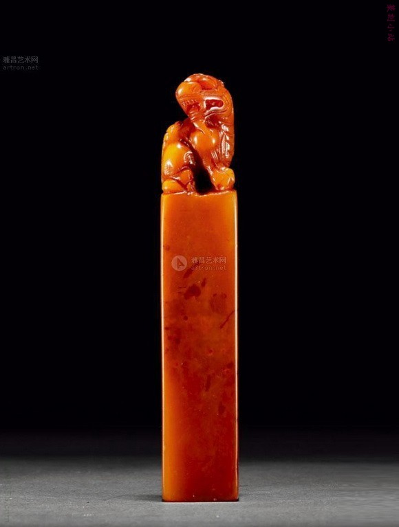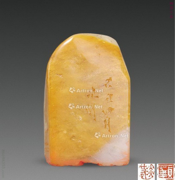 说明:材质上佳,色泽纯黄无瑕疵,血筋沁色明显,传世老包浆开门。印钮雕工精细,亦属难得。