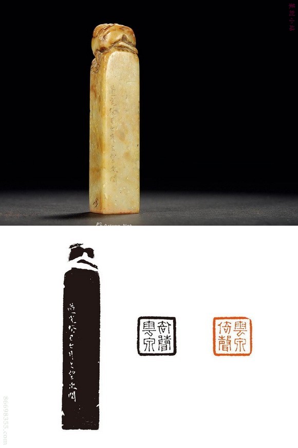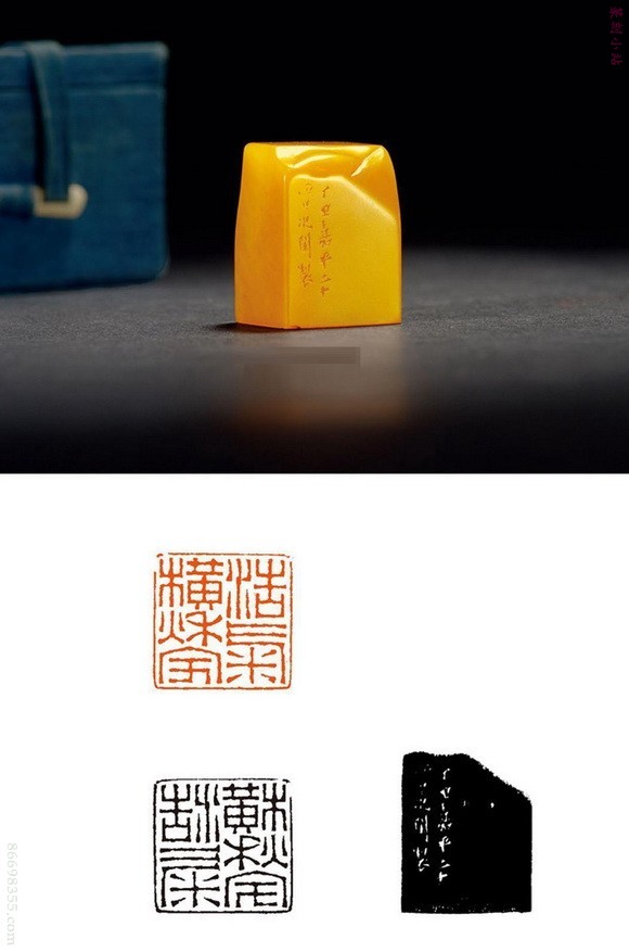 说明:此田黄石方章颜色明亮纯正,包浆浑厚,质地莹润、澄澈,宝光四溢。如此质地,更有此形制,实为田黄中之上品。“浩气横秋宇”语出自宋赵以夫词《龙山会》“九日无风雨。一笑凭高,浩气横秋宇。”贵比黄金的佳材与名家篆刻的完美结合,可谓是尽善尽美,当珍之宝之。