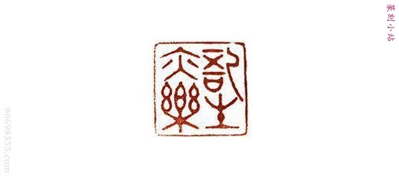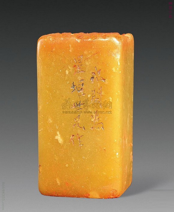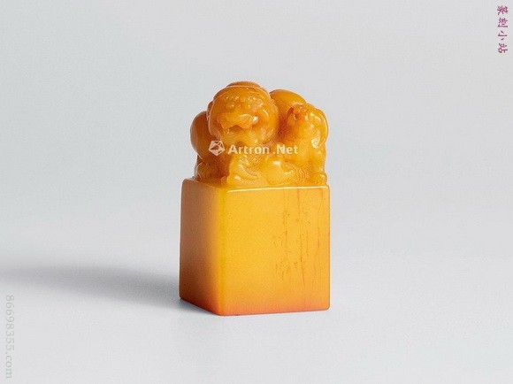 橘皮黄色。石质温润凝腻,红筋明显如血脉。顶部雕大小双狮,姿态威武生动,“狮”“师”同音,借谐音太师少师,寓意辈辈高官。印面篆书阳文“吾生亦乐”,乃清中期浙派风格,字风严正,静逸沉茂。
