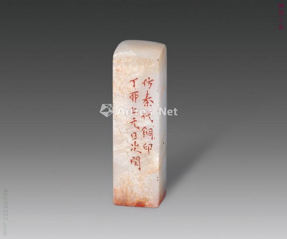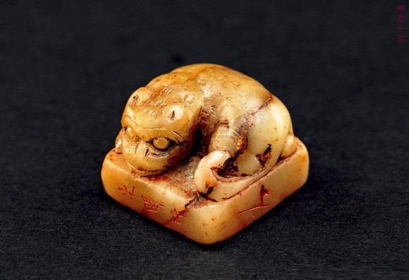 此方章温润油凝,圆雕瑞兽造型生动,刀法率意古拙,风格老辣,为典型浙派风格,边款刻“次闲作”,底部印文“臣书刷字”,极具收藏价值。