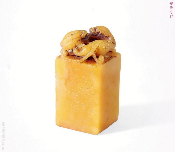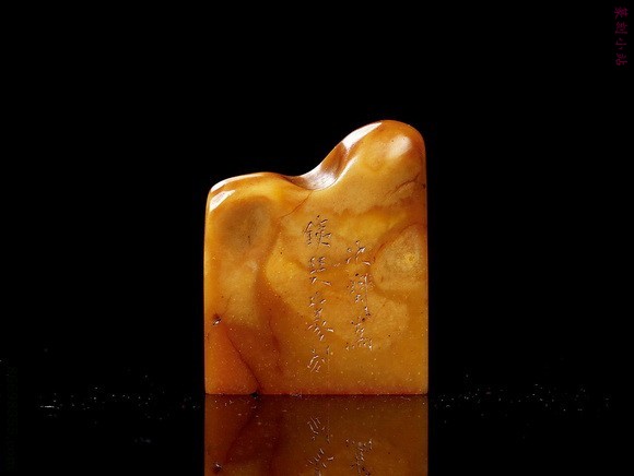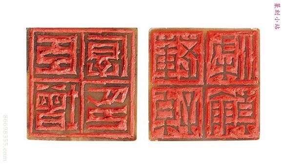 对印昌化石制,规格虽小,却刀法精湛。一方底刻印文“臣增厚印”,边款“庚辰(1820年)秋七月刻于补罗迦室,赵之琛”。另一方底刻印文“莲孙染翰”,边款“次闲拟汉朱文”。细观格中印文,纤细巧妙,虚实相生,既互相避让,又聚为一体,其转折断笔处更显古旧。