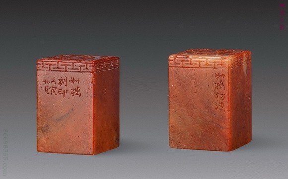 6118 清 赵之琛刻红芙蓉冻石博古钮对章