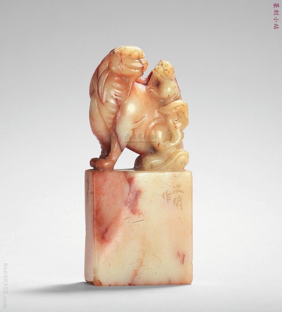 此方浙派朱文印出自赵次闲手笔,此刻采取上紧下松的章法,叫人观之赏心悦目。材属寿山佳石,色泽美艳沉厚,红白交融,温腻脂润,包浆浑穆古厚。圆雕太狮少狮钮,太狮侧首蹲立,与少狮相对,瞠目而视,披肩毛发,脊线秀挺,肌骨刚健。少狮欢腾嬉戏,攀于太狮身上,生动可爱。运刀精确细密,磨砻圆润光洁,堪称印石珍品。