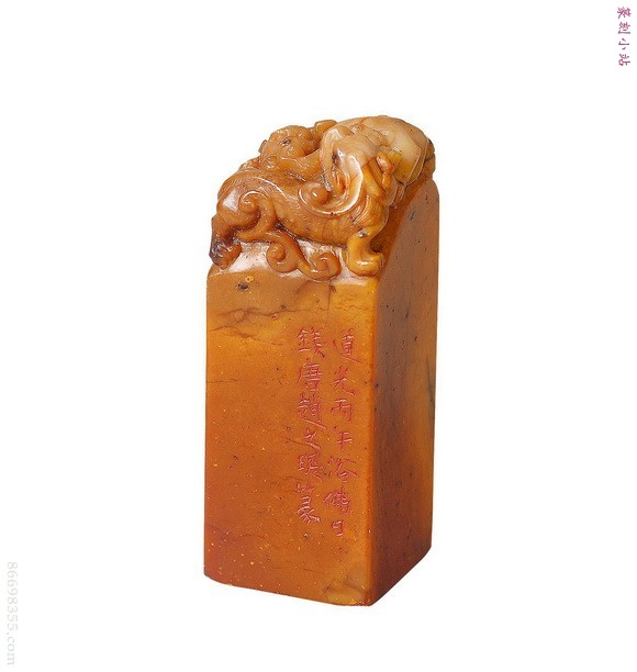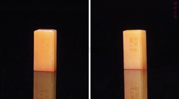 此章方形,甚是小巧精致,以上等田黄为雕琢材质,发色周正,纹理清晰,外壁光素无纹,一面雕有“次闲拟秦人印”六字,阳刻印文,字风俨有上古遗韵。田黄因其色正质润,美玉莫竟,自古以来,即为世之所珍。文人雅士、官宦巨贾皆钟情于斯。据清《寿山石记》载:“距福州府治六十余里,有坑名“五花”。《志》云:所产石类珉。……旧闻宋时采取病民,有司言上,请得以巨石塞坑路,由是取之者少,即得之亦不甚示宝于人。”清乾隆皇帝尤为喜爱田黄石,为开采寿山田黄更是不惜大兴土木,《观石录》载其:“丁巳后,大开山,日役民一二百人,环山二十里,丘陇亩亩,皆变易处。……较之宋坑造器,民劳百之。”所征福建寿山田黄取“福寿田丰”之意用以祭天。除此之外亦取田黄精品去料为章,宝而重之。