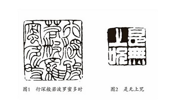 黄士陵作于1876年的《心经》组印是他早期作品的代表。他早年私淑陈鸿寿、邓石如、吴让之的风格在这套组印中多有表现,如邓石如风格的“行深般若波罗蜜多时”(图1),浙派风格的“是无上咒”(图2)。黄士陵取法浙派的作品都集中于这一时期,如“只寄得几点相思”、“李士芬印”,还有临黄易的“金石癖”,在以后有明确纪年的作品中极少有浙派风格的。