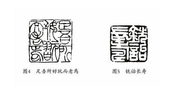 黄士陵临摹过吴让之的不少作品,如“足吾所好玩而老焉”、“丹青不知老将至”、“自称臣是酒中仙”等,目前所见最早有纪年的为“光绪壬午”(公元1882年)所临的“足吾所好玩而老焉”(图4)。在次年所作“张琮印章”中,黄士陵在边款中记“完白让之二法参用”。吴让之是继邓石如而有大成者,作品水平远较邓石如整齐。黄士陵师法吴让之,不仅有作品水平方面的考虑,更可能是吴让之自如的冲刀吸引了他。正是从学习吴让之开始,黄士陵的用刀开始转向爽利的冲刀,露出了他成熟印风的刀法雏形。如他1883年所作的“悼琴旧馆”及稍后所作的“铣诒长寿”(图5)中,一些线条与转折已有他成熟期处理的风韵。