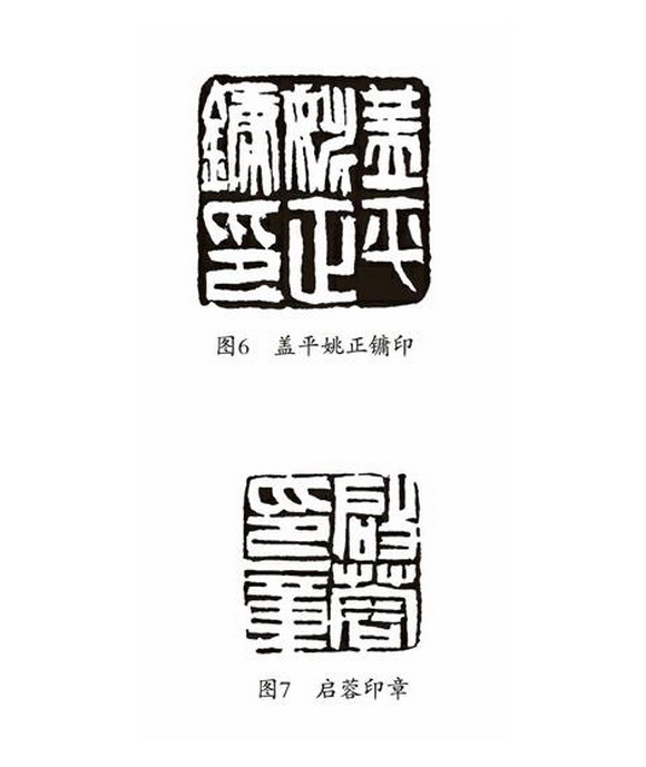黄士陵用刀出锋的习惯也来自吴让之。吴让之的一些白文印,线条起收处时露刀痕,如“盖平姚正镛印”(图6)。从黄士陵“启蓉印章”(图7)这样明显师承吴让之的作品中,我们可以看到类似且更突出的刀痕,这一点最终成为黄士陵成熟印风的突出特色之一。