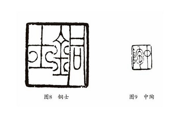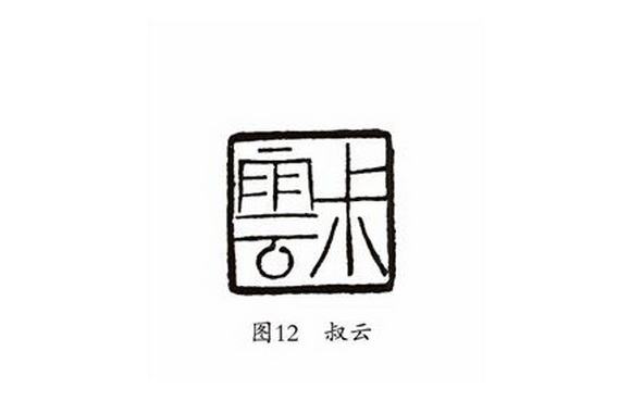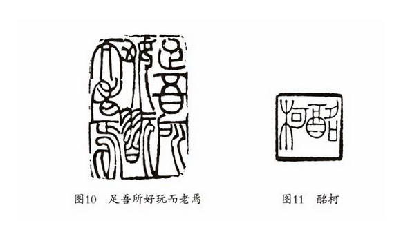 吴让之对黄士陵的另一大影响是朱文印的圆笔运用。吴让之是圆笔运用的大师,许多作品极具形式美,如“铜士”(图8)、“中陶”(图9)。这些圆笔运用中常配之以对比型的章法,既生动又有气势。吴让之朱文线条还常作方起方收,圆笔也颇多如此处理者,如“足吾所好玩而老焉”(图10)。这些特点也为黄士陵借鉴和吸收,从他的一些作品如“酩柯”(图11)、“叔云”(图12)中,不难看出这种影响的存在。