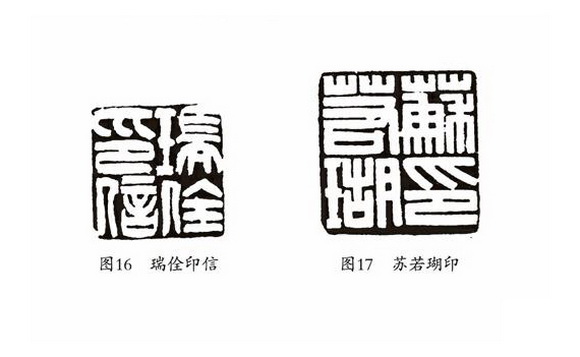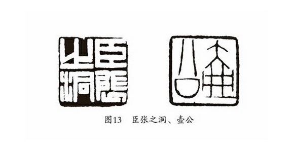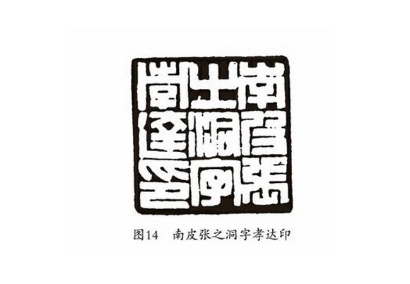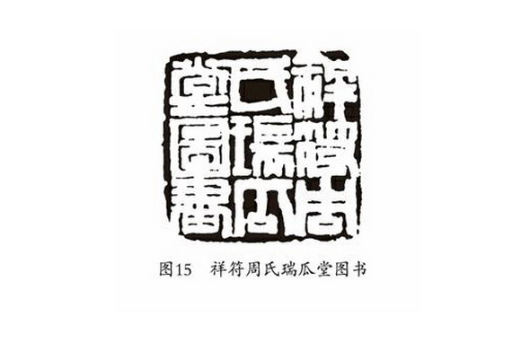 黄士陵对赵之谦的取法较晚,且主要限于白文形式。从黄士陵的边款纪年中看,最早的作品为“广雅书院经籍金石书画之印”,纪年为“光绪戊子”(公元1888年)。而此时他为张之洞所作的对章“臣张之洞”、“壶公”(图13),个人风格已趋于成熟。“臣张之洞”中的大块留红就有赵之谦的影子。此时的黄士陵经历了南昌谋生,一下广州,北京国子监肄业,二下广州,结识了许多文人墨客、金石名家,见到了大量的金石篆刻资料,并正在为吴大澂编选钤拓《十六金符斋印存》,识见既广,眼力亦高,篆刻也已显露出明显的个人风格。他对赵之谦的取法不可能像对邓石如、吴让之的临习那样亦步亦趋,而是取己所需,赵之谦白文印端庄方正、不事残损等处理习惯符合黄士陵的审美观,他就化为己有。他所作的“南皮张之洞字孝达印”(图14)系追仿赵之谦的“祥符周氏瑞瓜堂图书”(图15),但仍具自家风格。对赵之谦的取法完全是主动的、有选择的。在1893年款属“仿赵撝叔”的“水部冷官”印,1896年款属“参赵撝叔意”的“铨萃长寿”印中,取法赵之谦的痕迹已不明显,而自家的风格已相当完善。黄士陵对赵之谦的研习取法,在促使他白文印结构、线条变圆为方上功不可没,同时他不事残损的理念也受赵之谦的影响。