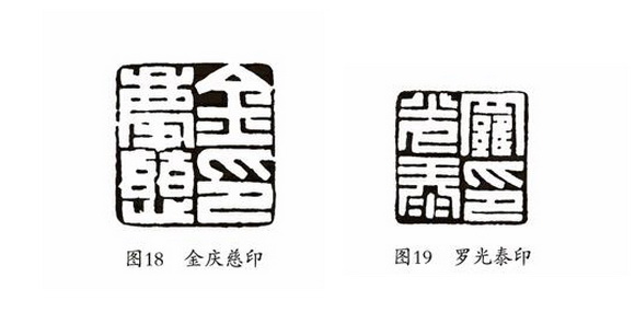 黄士陵对汉印的学习也很早,如1882年所作的“瑞佺印信”(图16)、“曾为大仆郎官”、“蒋乃勋印”等边款中均有仿汉印的记载,但此时正是他学习吴让之的高峰期,对汉印的学习偏重于形式,在技法上还是吴让之的成分大一些。随着黄士陵所见玺印金石日多,特别是1888年,他亲手为吴大澂钤拓《十六金符斋印存》这一收印甚多的古铜印谱,使他可以近距离地观赏大量的古印实物,这种学习条件可以说是得天独厚的。在黄士陵有明确纪年的作品中,以1888年为分界,其前后的白文印风格有明显的差异。在此之前,他的白文印是汉印格局,技法上则表现出吴让之的影响;在此之后,他的白文印明显倾向于汉铸印,吴让之那种笔意明显的白文线条基本上销声匿迹了。后来,黄士陵的朱文印集中取法吉金文字,古雅挺劲的风格日渐突出,同时,其白文印的线条也更趋方挺爽利,和其朱文配合。大约在1891年前后,其白文印风已完全成熟,如他1891年所作的“苏若瑚印”(图17),1892年所作的“金庆慈印”(图18),1893年所作的“罗光泰印”(图19)。在1896年,黄士陵刻了一方“少司马章”(图20),边款记为“仿汉官印”,实则已是他典型的自家风格了。