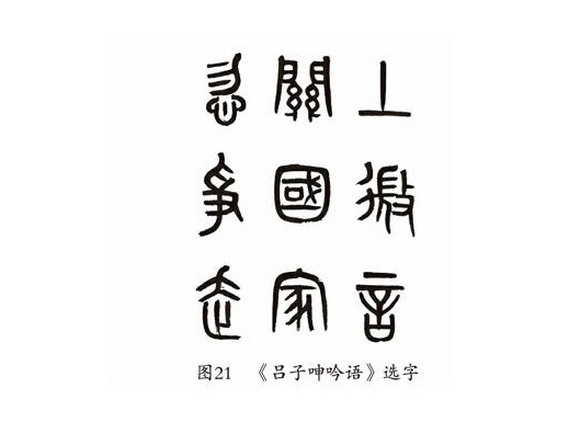 从某种意义上说,黄士陵也是“印从书出”的印人,从他的篆书墨迹来看,比如长篇的《吕子呻吟语》选字(图21),和他的印风是十分契合的。从他的篆书中,我们几乎可以感受得到其篆刻用刀銛锐而见锋芒的意趣。黄士陵的“印从书出”不像吴让之、徐三庚那样较重形,黄士陵取的是神,加之他“印外求印”成绩斐然,故而人们更乐于把他归于“印外求印”一系。