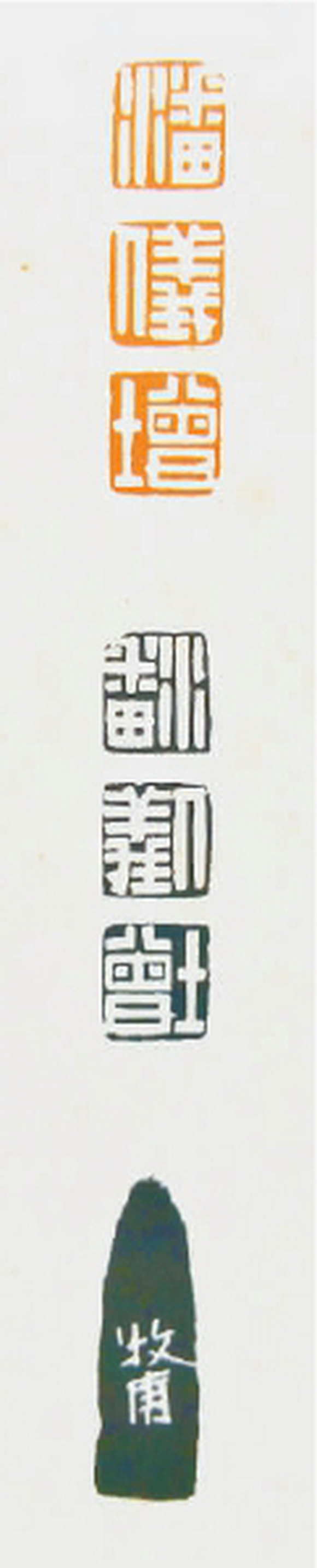 不久前,篆刻小站曾见有人发布了一方带有印章立面、印面、印蜕和刊有穷款“牧甫”二字的三连珠印章图片,即三连珠“潘-仪-增”白文印。但凡从事篆刻研究和创作的专家都知道,这是一方罕见的黄牧甫遗印。这让篆刻小站想起在杭州举行的西泠印社2014年秋季十周年庆典拍卖会“文房清玩·晚清六大家篆刻专场”上,1892年至1899年间,黄牧甫篆刻的三连珠“潘-仪-增”印等10方自用印在西泠印社以241 . 5万元(含佣金)成交。这方三连珠“潘-仪-增”印也被收入《文房清玩·晚清六大家篆刻专场》图录中。从外观上看,这是一方特征明显的高山冻石,其质地较纯,温润凝脂,印章立面中心不规则分布一些乳白色环晕,环多呈粉白棉絮状,大小分布多寡不一,体表微透明偏绿,加上大小环钮相扣,其观赏性更优于其他高山冻石。可谓石佳印美,故此印的艺术价值和收藏价值不言而喻。