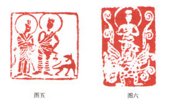 图四原印解释为“仙道”。《因果经》云:“尔时太子心自思惟,我今于伽阇山,示修苦行,日食一麻一麦,身形消瘦有若枯木。修其苦行,今满六年……我当受食,然后度生是念,已至尼连河侧,露地而坐,时彼林外有二牧牛女人,一名难陀、一名波罗,时净居天劝牧女言:今太子在林中,汝可供养。女人闻已,心大欢喜,即择肥壮粹牛人河洗浴,亲手自取淳乳,如法煎煮,即取乳糜盛满金钵至太子所,头面礼足而以奉献太子……”。据以上论,观其器具和行礼动作,此印应为“牧女献糜”。