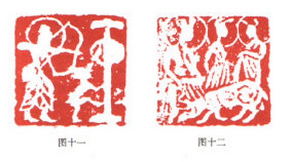 图十一原印认为拟汉画像所作“习射”,此题目恐有缺内涵,再者射手头顶光环,该印绝对与宗教有关。据《本行经》云:“净饭王与大臣娑呵提婆,谕诸释童子武艺之中谁能最胜,于戏场中安施铁鼓,提婆达多射彻三鼓,难陀即射亦彻三鼓。有司进弓,太子试弓,以弓力弱,令取库祖王所用良弓,太子牵挽,平胸而射,一箭穿过七个铁鼓,其箭射达十拘。卢奢复更别立铁猪,太子一箭便穿七铁猪,彼箭人地,即成一井……”。根据描述人的动势、立架来看,此印应是“诸王桷力”。