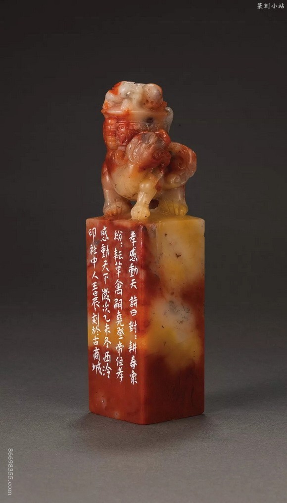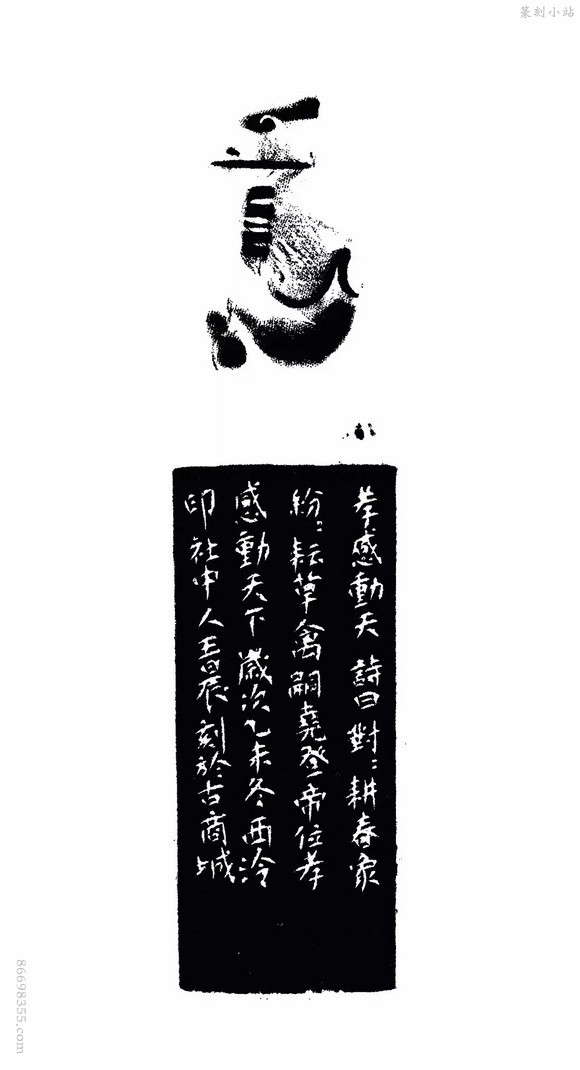 山东王晨师承李刚田,篆刻二十四孝,上下求索无所不能 印文:孝感动天 材质:老挝石 规格:3.0cm×3.0cm×12.5cm 边款:孝感动天。诗曰:“对对耕春象,纷纷耘草禽。嗣尧登帝位,孝感动天下。”岁次乙未冬,西泠印社中人王晨刻于古商城。 印文:亲尝汤药 材质:老挝石 规格:3.1cm×3.1cm×12.2cm 边款:亲尝汤药。诗曰:“仁孝闻天下,巍巍冠百王。母后三载病,汤药必先尝。”西泠印社中人王晨刻。 页码: 页 1, 页 2, 页 3, 页 4, 页 5, 页 6, 页 7, 页 8, 页 9, 页 10, 页 11, 页 12, 页 13 印谱.教程.技法 - 分享 加微信获取:wenbaozhai365