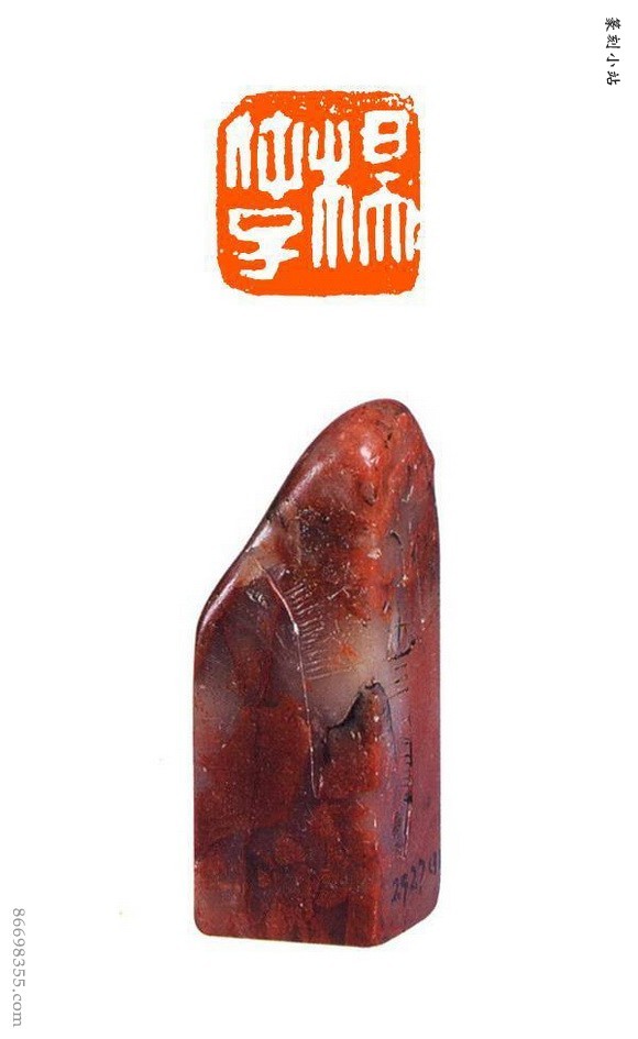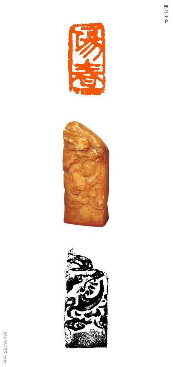 现代,石印,长方形,浮雕云龙纹,通高5cm,长2.1cm,宽1.1cm。作者杨仲子,书体介于隶楷之间,颇得情趣。