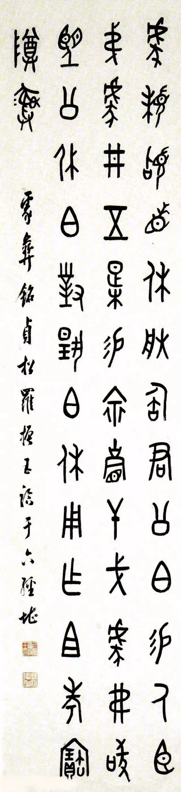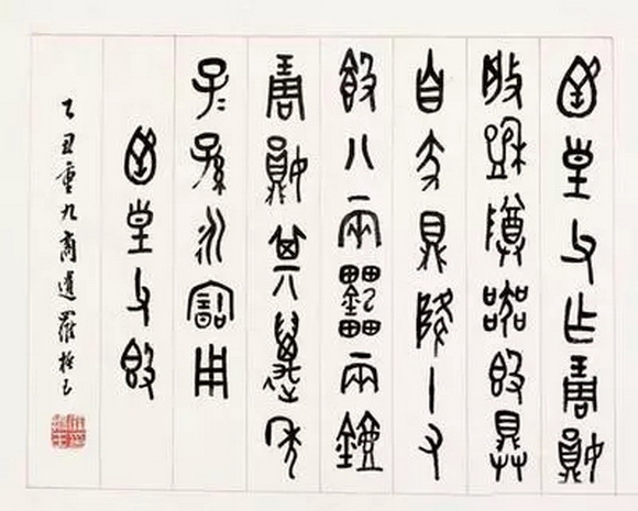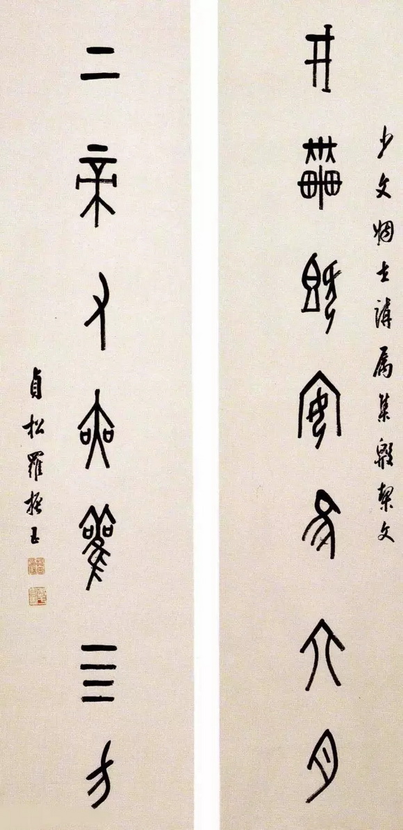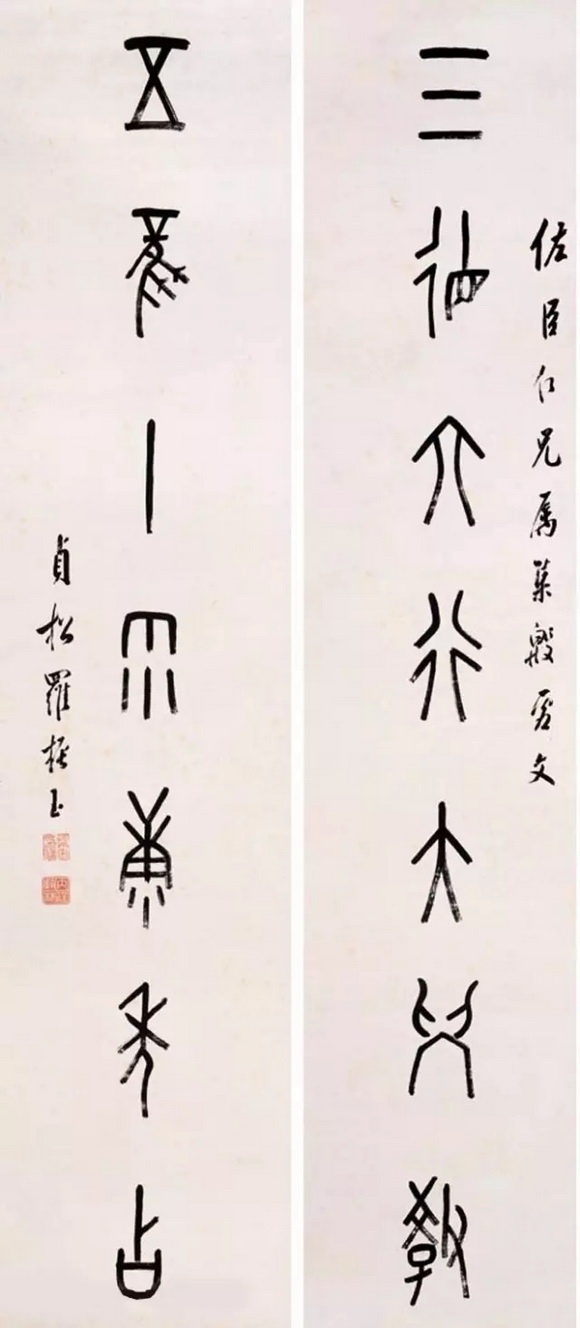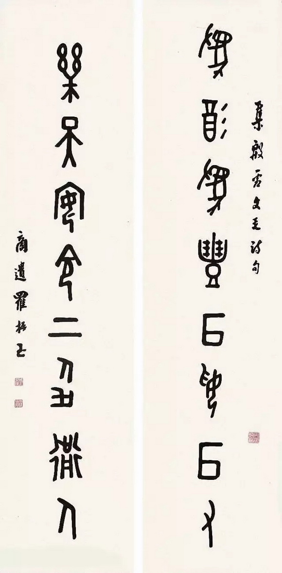 去冬,奔走南北,甸甸娠灾,四阅月间,益无寸晷。昨小憩尘劳,取殷契文字可识者,集成偶语,三日夕得百联。存之巾筒,用佐临池。辞之工拙非所计也。辛酉二月,雪翁记”。此“辛酉”,即一九二一年。这一年,罗氏五十六岁,正是其书艺进人炉火纯青的创作阶段,也是他开始热衷于商卜文字人书之时。其文孙史学家罗继祖先生曾回忆说:“辛西年我八岁已能记事,舟见公为人写楹巾占总是集契文,大小篆倒反而少写。以)舀也常常如此,如果人家不指明要那一体的话,就统以契文应之。”