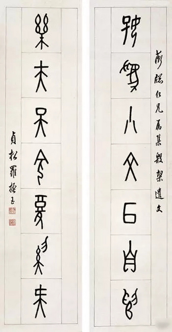 自中年后见到殷墟契文,兴味大增,于是师法为之一变,由篆而人甲骨,不断临写揣摩,终于开创了一种前所未有的甲骨文书法。并以考释的甲骨文字编集楹联,遂有《集殷墟文字楹联》问世。罗于跋中写道:“自客津沽,人事旁午,读书之日几辍其半。