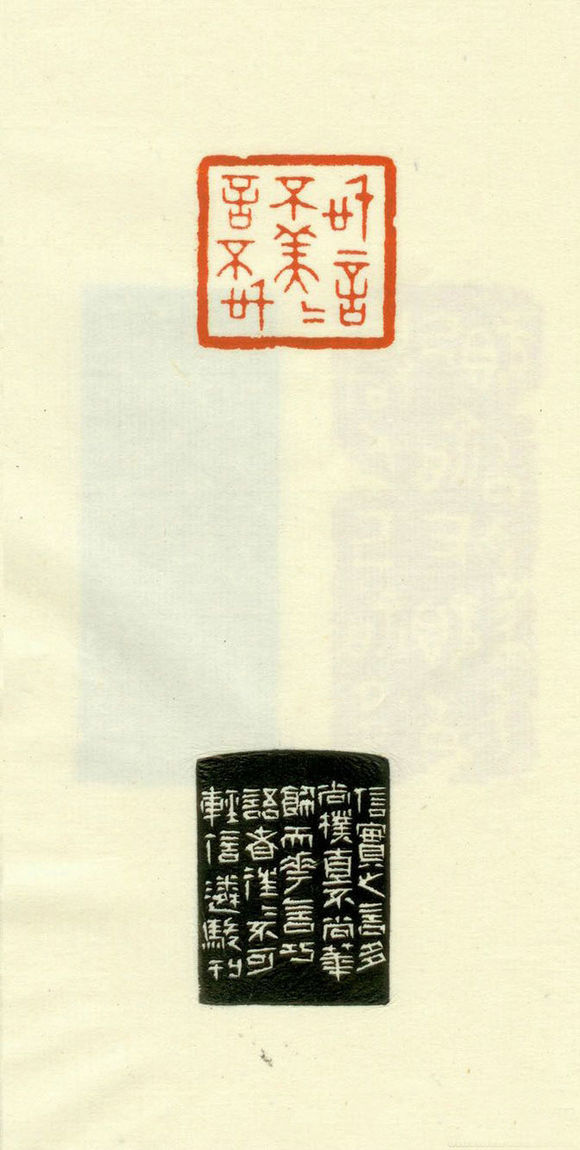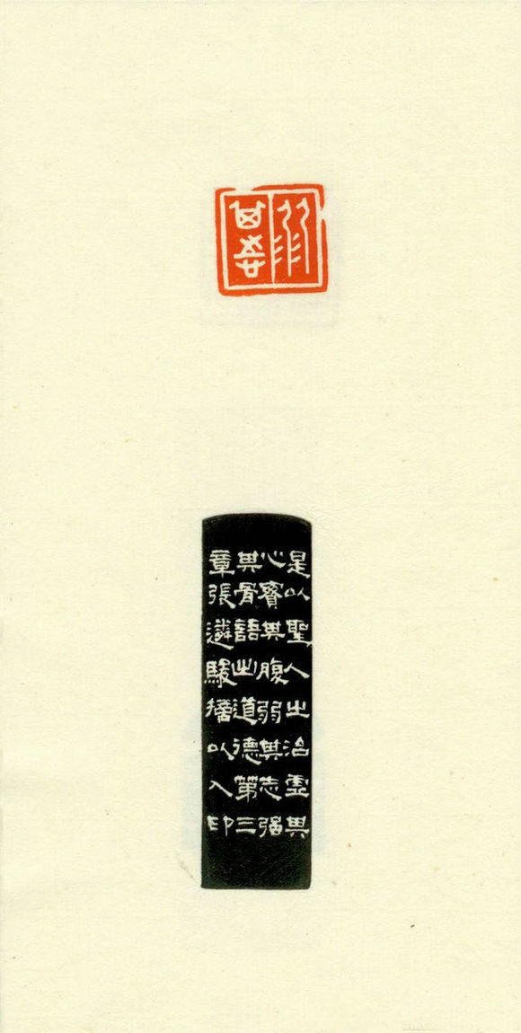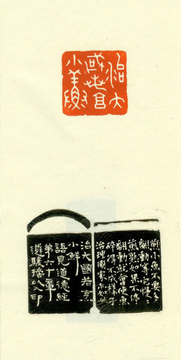 边款:煎小鱼不要多翻动,等它慢慢煎熟。如果不停翻动就会使鱼碎得不成样子。治理国家亦如此。治大国若烹小鲜。语见道德经,弟六十章,遴骏摘以入印。