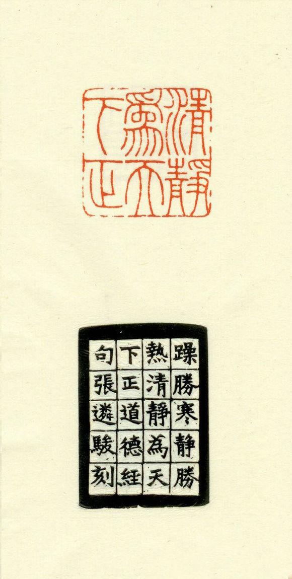 边款:躁胜寒,静胜热,清静为天下正。道德经句,张遴骏刻。