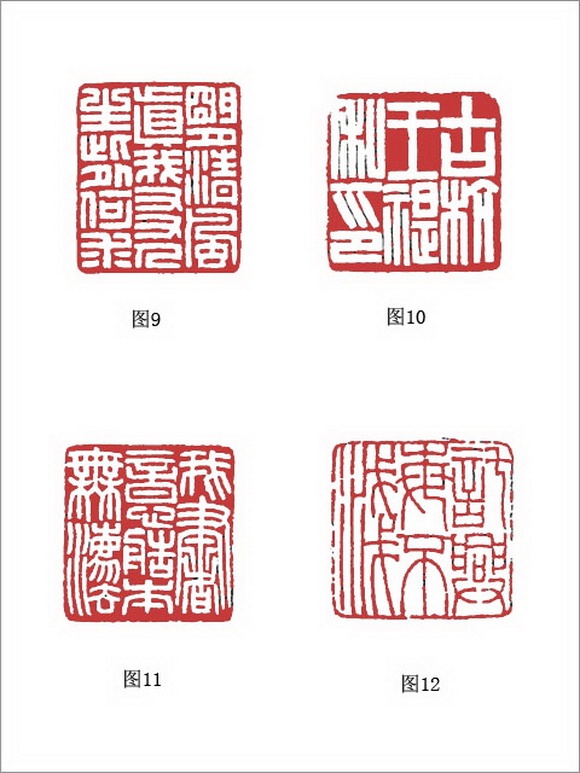 与当时的大多数篆刻家一样,王氏的篆刻走的也是“印宗秦汉”的道路。由于长期生活在杭州,自然饱受“浙派”篆刻的熏陶,留下了大批取法浙派的作品,如“锐侯鉴藏”(款曰:仿曼生法)(图1)、“麋砚斋”(款曰:仿种榆仙馆篆法)(图2)、“惯迟作答爱书来”(款曰:师赵次闲,略变其法)(图3)。同时对皖派也有尝试,“领略古法”(图4),便是以邓石如为师法对象。流派印滥觞于元,兴盛在明清,王氏对前人之作,既不盲从,也不轻易地否定,而是反刍细嚼,取其精华,弃其糟粕,如“闲卧白云歌紫芝”(款曰:用元人法刻之)(图5),“春愁如雪不能消”(款曰:仿明人刻印)(图6),“人书俱老”(款曰:仿明人刻印之工整者)(图7),“人生系时命,安得无苦乐”(款曰:《学山堂印谱》中有此印,福厂小变其体而刻之)(图8),“明月清风真我友,人生此外何求”(款曰:曾见归文休作此印,福厂变其体而刻之,虽不敢争胜古人,然妥帖安详过之)(图9),此外还有“古杭王禔私印”(款曰:仿二金碟堂法)(图10),“我书臆造本无法”(款曰:略师让之先生法)(图11),“讬兴每不浅”(款曰:仿吴圣俞)(图12)等等。由此可见,王福庵对历代的流派印风几乎都有涉足,由此而形成的王福庵印风的面目也是多样化的。然而,无论取法如何广泛,王福庵印风的基点则是工稳、秀美,以王福庵等人为代表的这类颇具装饰性的印风,被今人冠以“新浙派”。