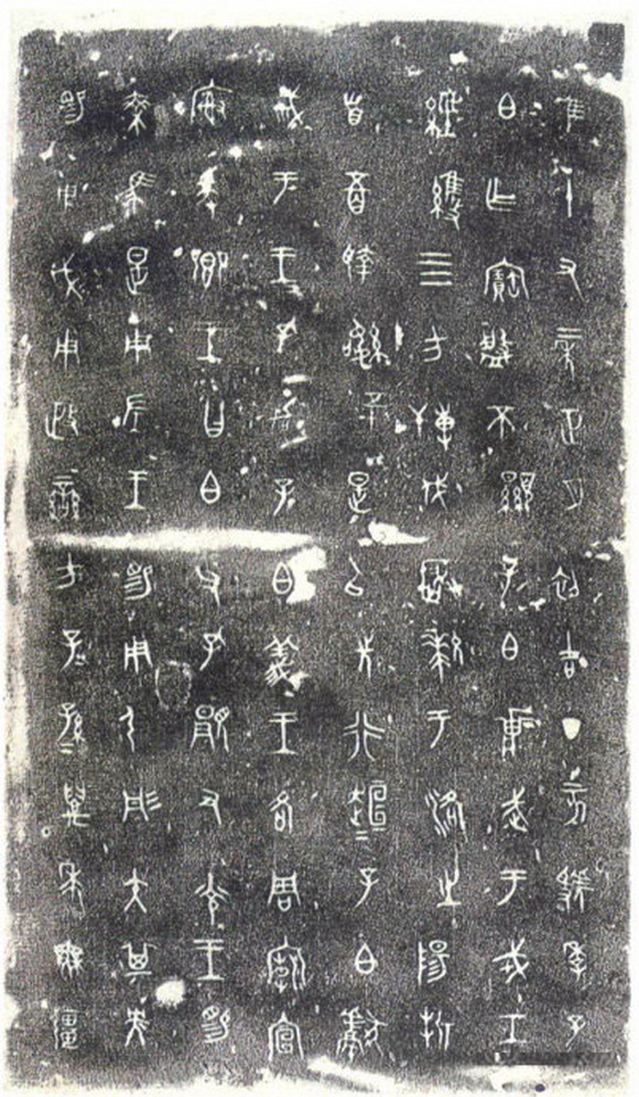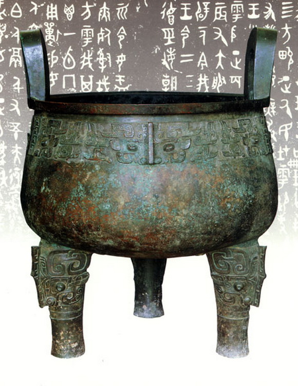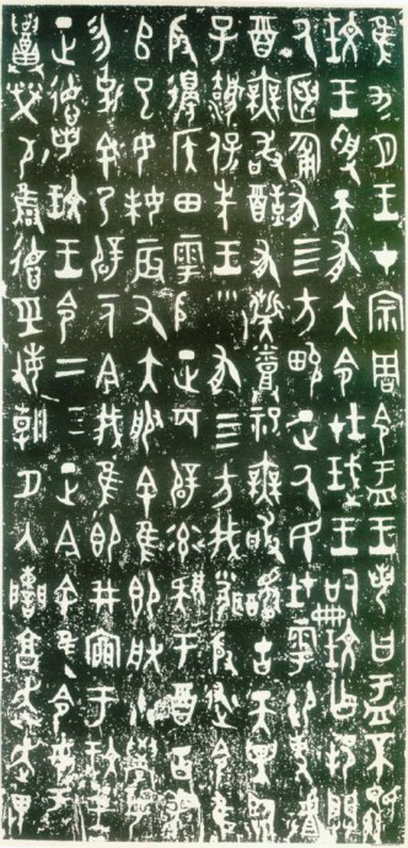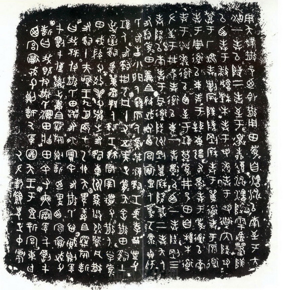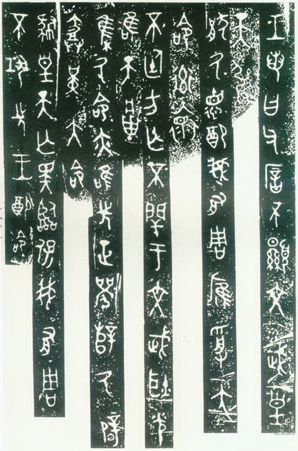 《毛公鼎》,现存台北故宫博物院,传清道光末年于陕西岐山出土 。毛公鼎因作者毛公而得名,是现存青铜器铭文中较长的一篇。其结体长方匀称,较散氏盘稍端整。线条遒劲稳健,布局妥贴,充满了理性色彩,显示出金文已发展到极其成熟的境地。李瑞清题跋鼎时说:“毛公鼎为周庙堂文字,其文则尚书也,学书不学毛公鼎,犹儒生不读尚书也。”