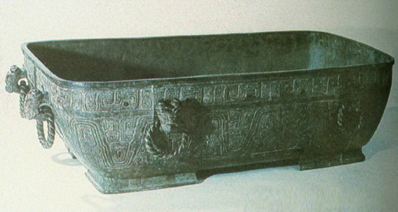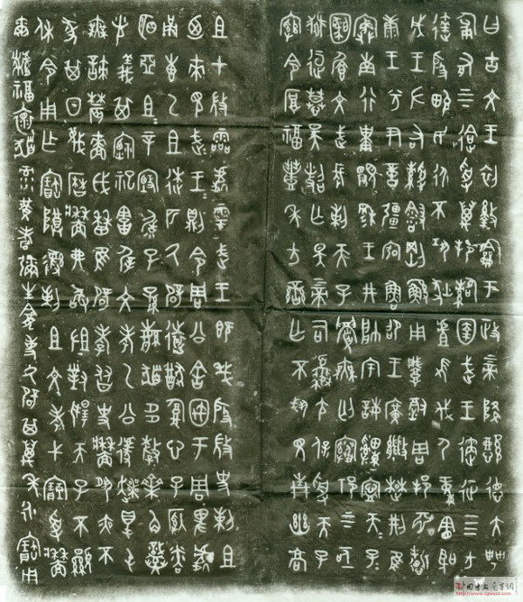 《大盂鼎》,体势严谨,字形和布局都十分质朴平实,点画保留有甲骨文的刀刻意味和尖笔特点。其特殊的肥笔和块面,强化了奇诡的别趣。其用笔方圆兼备,具有端严凝重的艺术效果,是西周早期金文书法的代表作。