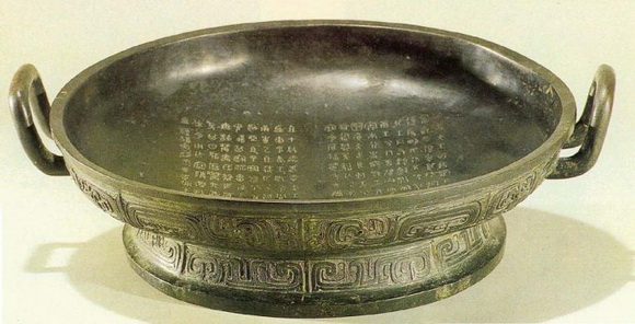 《墙盘》,盘内铸有铭文二百多字,字形整齐划一,均匀疏朗,字形长方,转折多圆笔,呈现一种端庄而不呆板,活泼而不流媚的艺术风格。此外,其笔画粗细一致,笔势流畅,已有后世小篆的笔意。