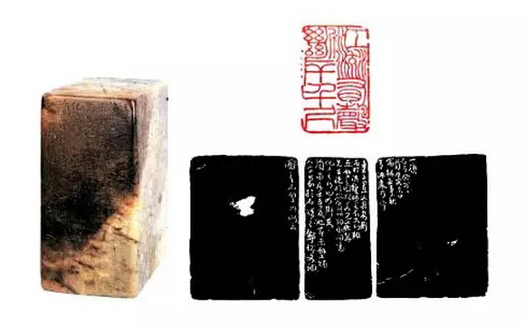 篆刻中的“残破”,是有传统依据的,也是“印宗秦汉”的一种具体体现。两千年的印现在出土,哪一个不残?大家再看这方印石头的花纹,上面有肌理的变化,是经火烤以后得之。边款的文字不多,用一面就足够了,但是邓石如用了三面,而且占的比例都不一样,位置也不一样,长短也不一样。他是有意识地通过这样的边款处理、这样一种类似于书法中信札的结构,依照石头上的花纹与自然形成的肌理,使我们的欣赏产生一种对山峦云海的想象。