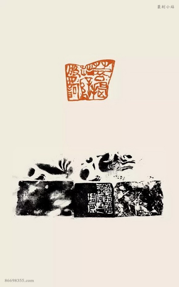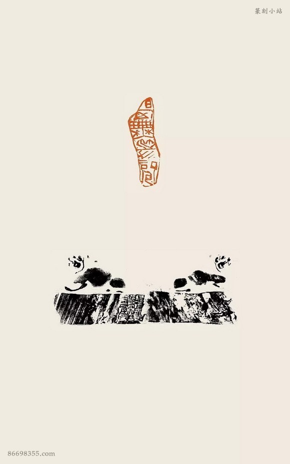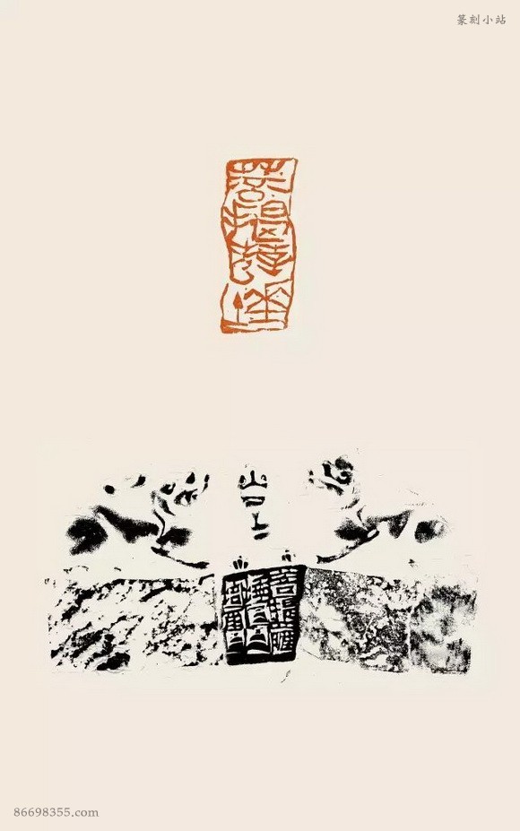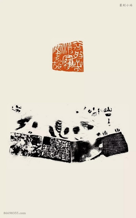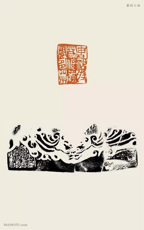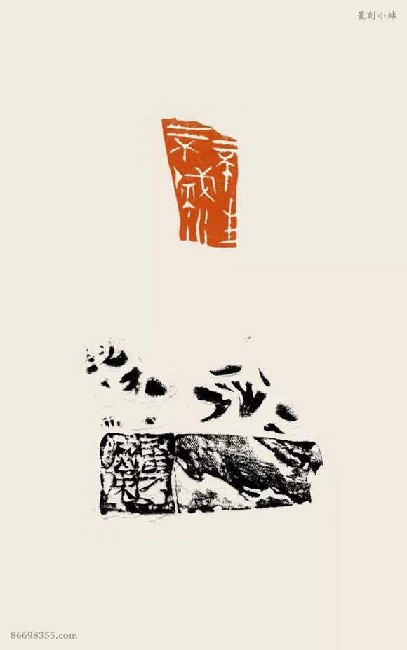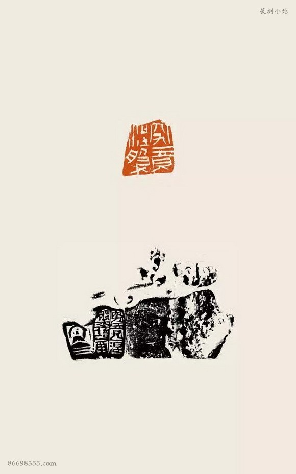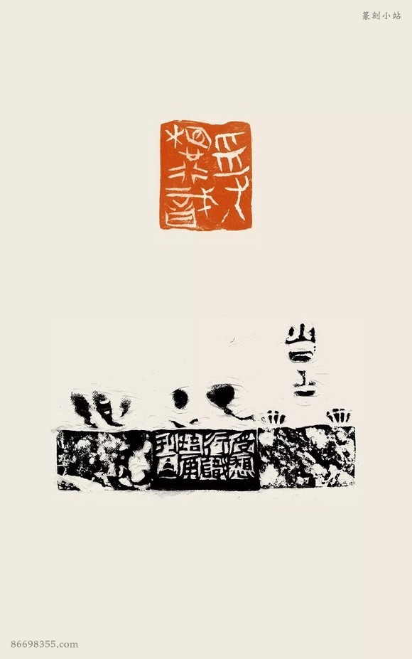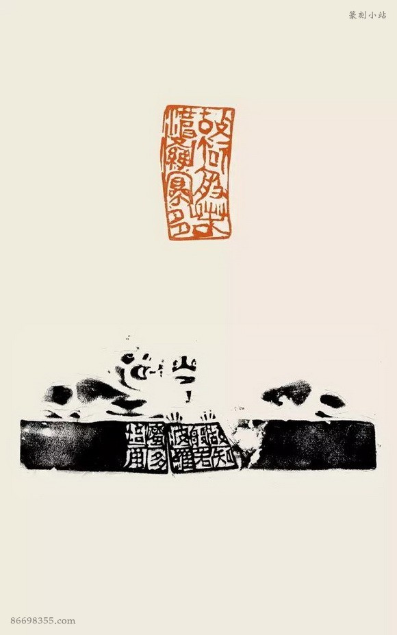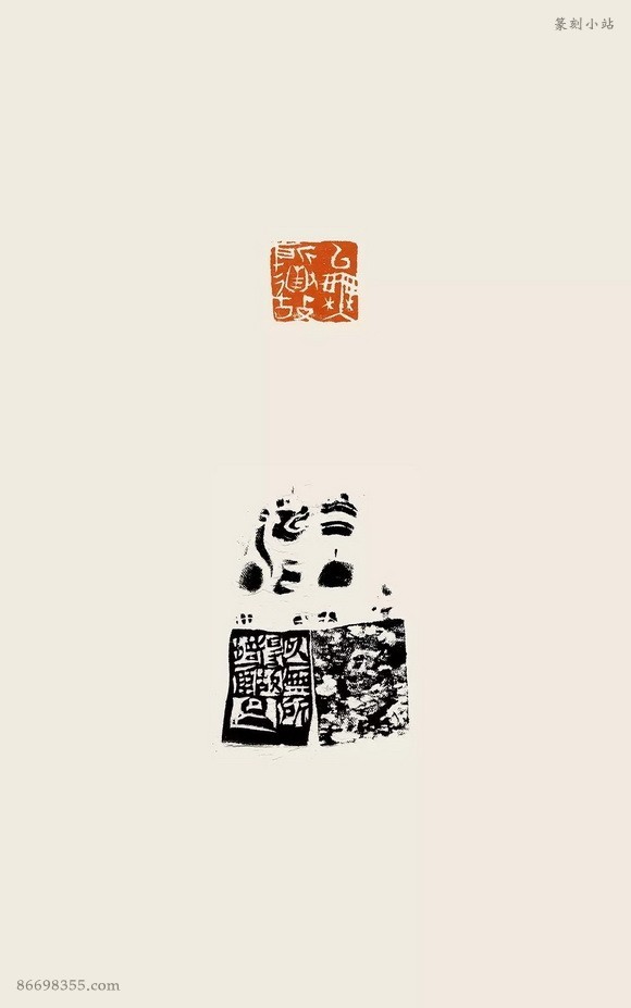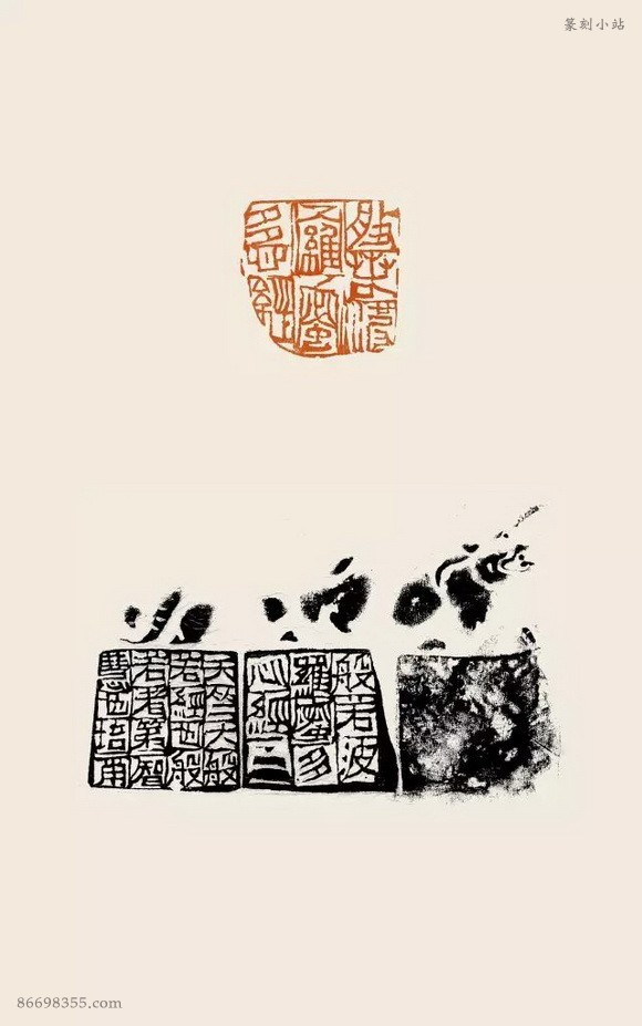 这是篆刻小站五年前在某展上看到的朱培尔在异形昌化石上所创作的一套以心经为内容的作品。刻异形印很难免俗,但他做到了。但这组印的奇妙,还是在于其中的刀法。朱培尔的刀法,用的是前人所不多见的一种最有利于揭示刀法本真的姿态。尤其是他的冲刀,会用的非常感性,可以自由随机的变化,会因为刀的不同、石头甚至石质的不同,随意、随机,自然、放纵地去运转刀的角度、速度、力度,甚至刻的深度,努力使刀法成为一种连续的、刀刀生发的、反映性情和情绪的有机表达,使运刀的节奏成为一种有机的律动。