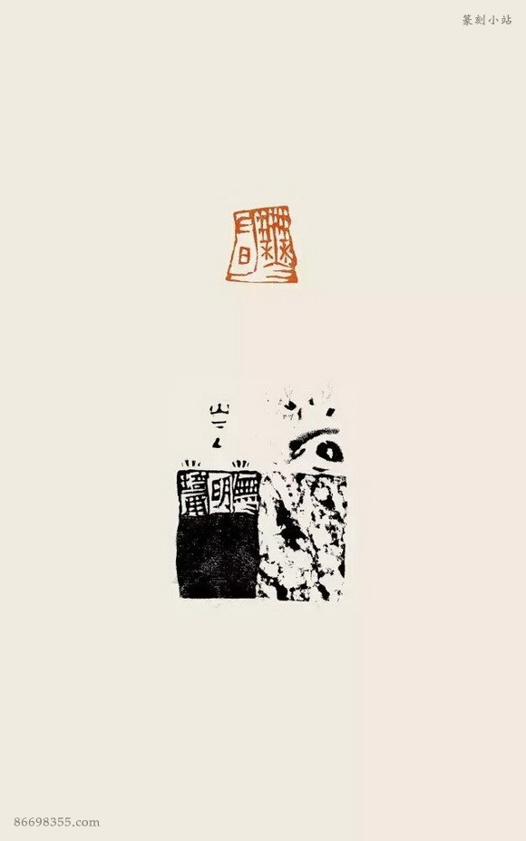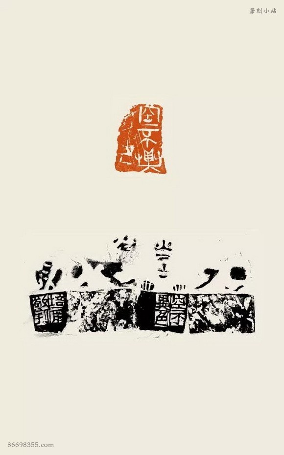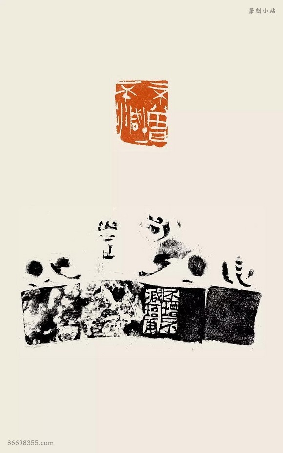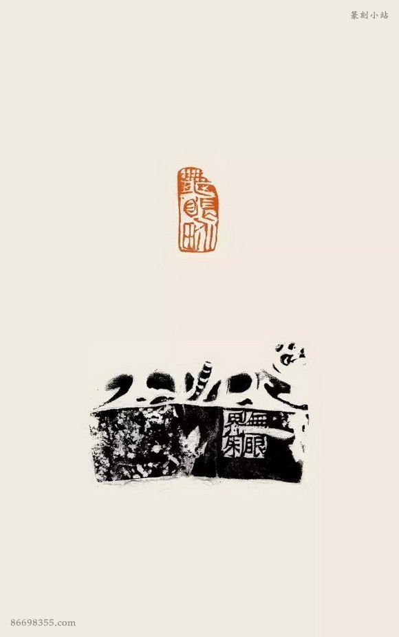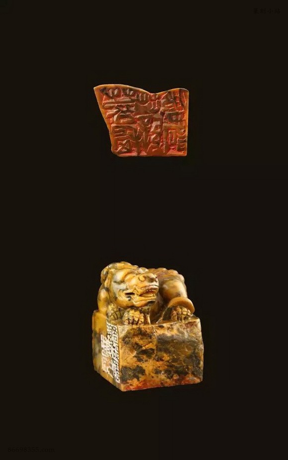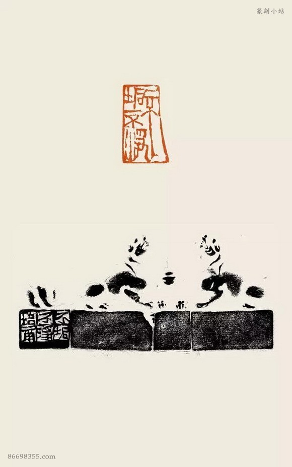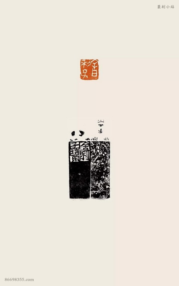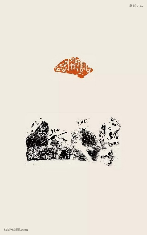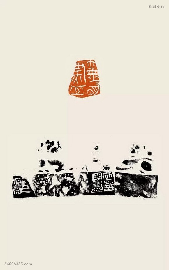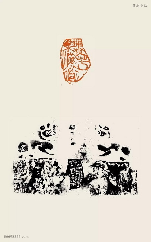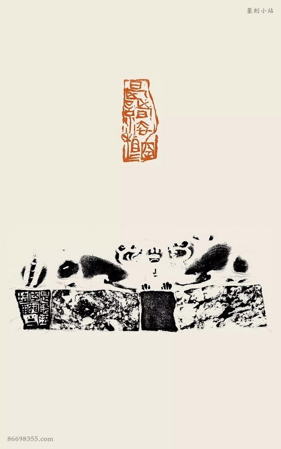这是篆刻小站五年前在某展上看到的朱培尔在异形昌化石上所创作的一套以心经为内容的作品。刻异形印很难免俗,但他做到了。但这组印的奇妙,还是在于其中的刀法。朱培尔的刀法,用的是前人所不多见的一种最有利于揭示刀法本真的姿态。尤其是他的冲刀,会用的非常感性,可以自由随机的变化,会因为刀的不同、石头甚至石质的不同,随意、随机,自然、放纵地去运转刀的角度、速度、力度,甚至刻的深度,努力使刀法成为一种连续的、刀刀生发的、反映性情和情绪的有机表达,使运刀的节奏成为一种有机的律动。
