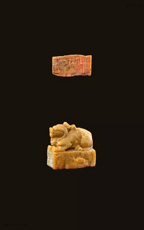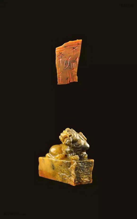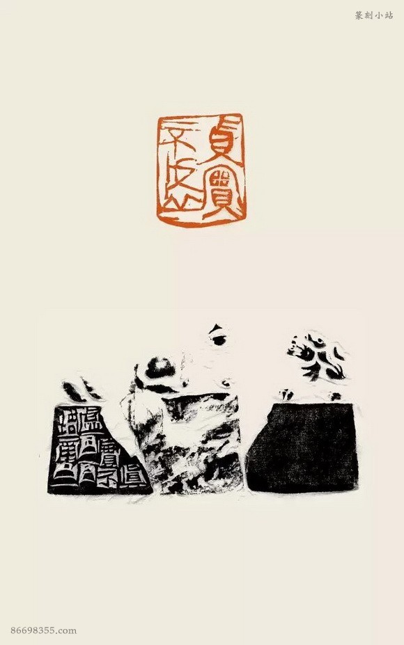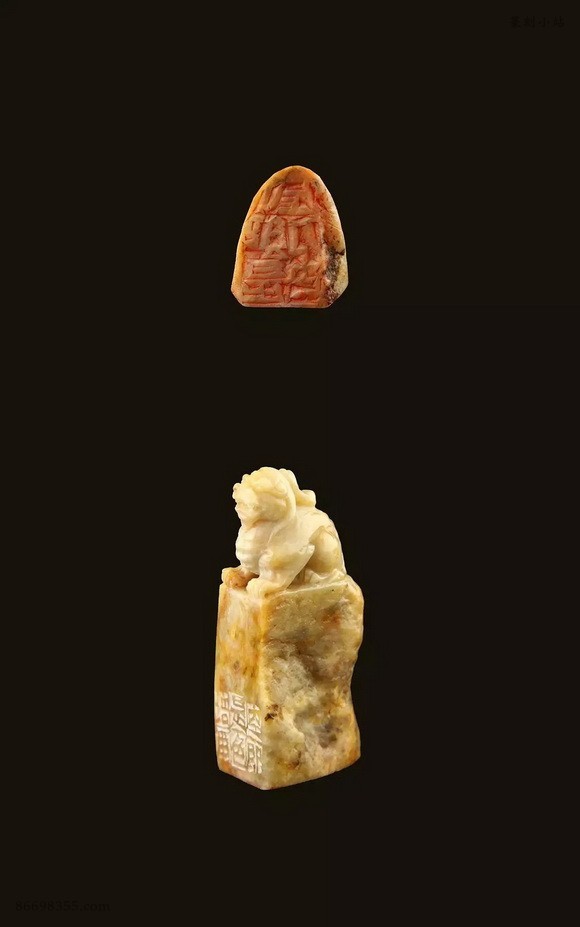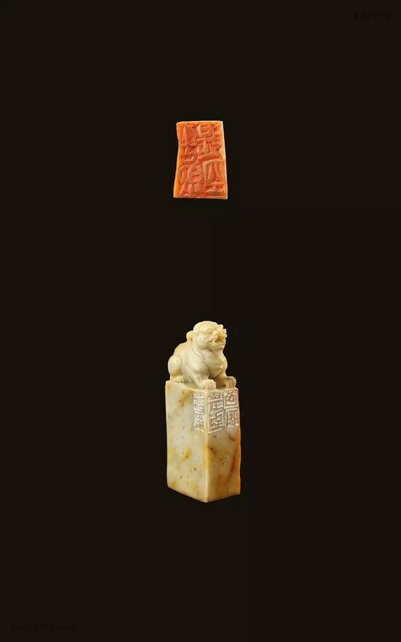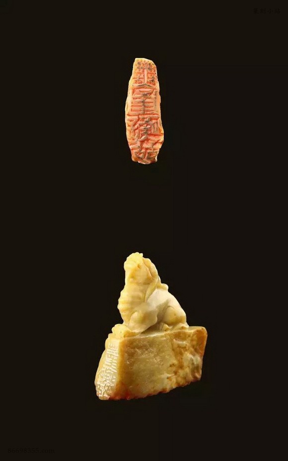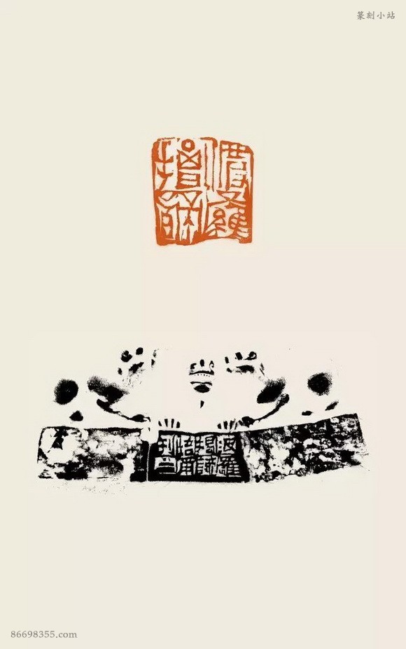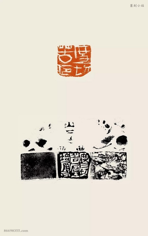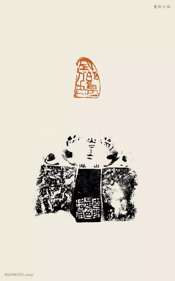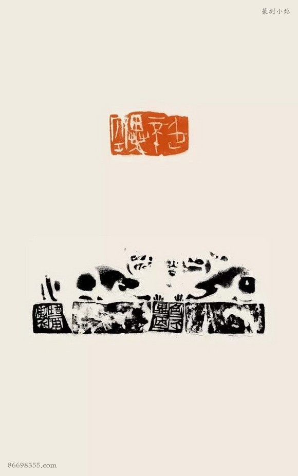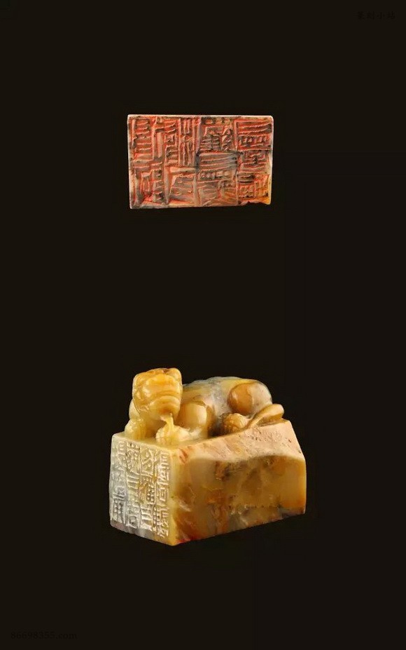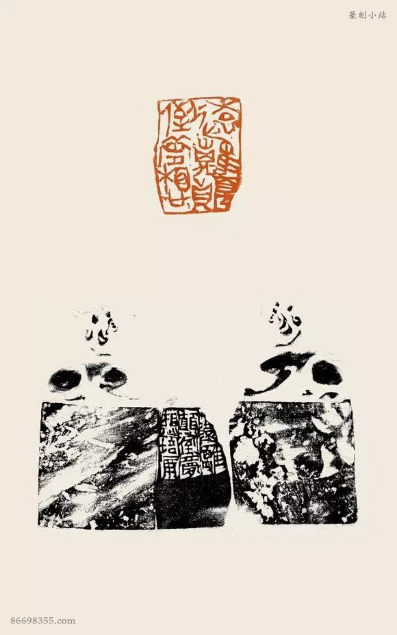 这是篆刻小站五年前在某展上看到的朱培尔在异形昌化石上所创作的一套以心经为内容的作品。刻异形印很难免俗,但他做到了。但这组印的奇妙,还是在于其中的刀法。朱培尔的刀法,用的是前人所不多见的一种最有利于揭示刀法本真的姿态。尤其是他的冲刀,会用的非常感性,可以自由随机的变化,会因为刀的不同、石头甚至石质的不同,随意、随机,自然、放纵地去运转刀的角度、速度、力度,甚至刻的深度,努力使刀法成为一种连续的、刀刀生发的、反映性情和情绪的有机表达,使运刀的节奏成为一种有机的律动。